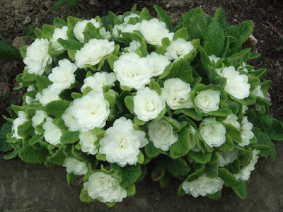 Primula polyantha "Dawn Ansell" a vigorous, naturalising double primrose, perfect for a shady woodland spot.